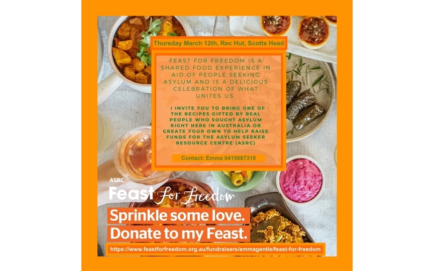 I am hosting a Feast for Freedom at the Scotts Head Rec Hut on March 12th 2026. Come along and bring a dish- I have recipes from the amazing chefs at the ASRC- asylum seekers who have kindly shared their wonderful recipes. Or create a dish from one of the many countries our asylum seekers come from.