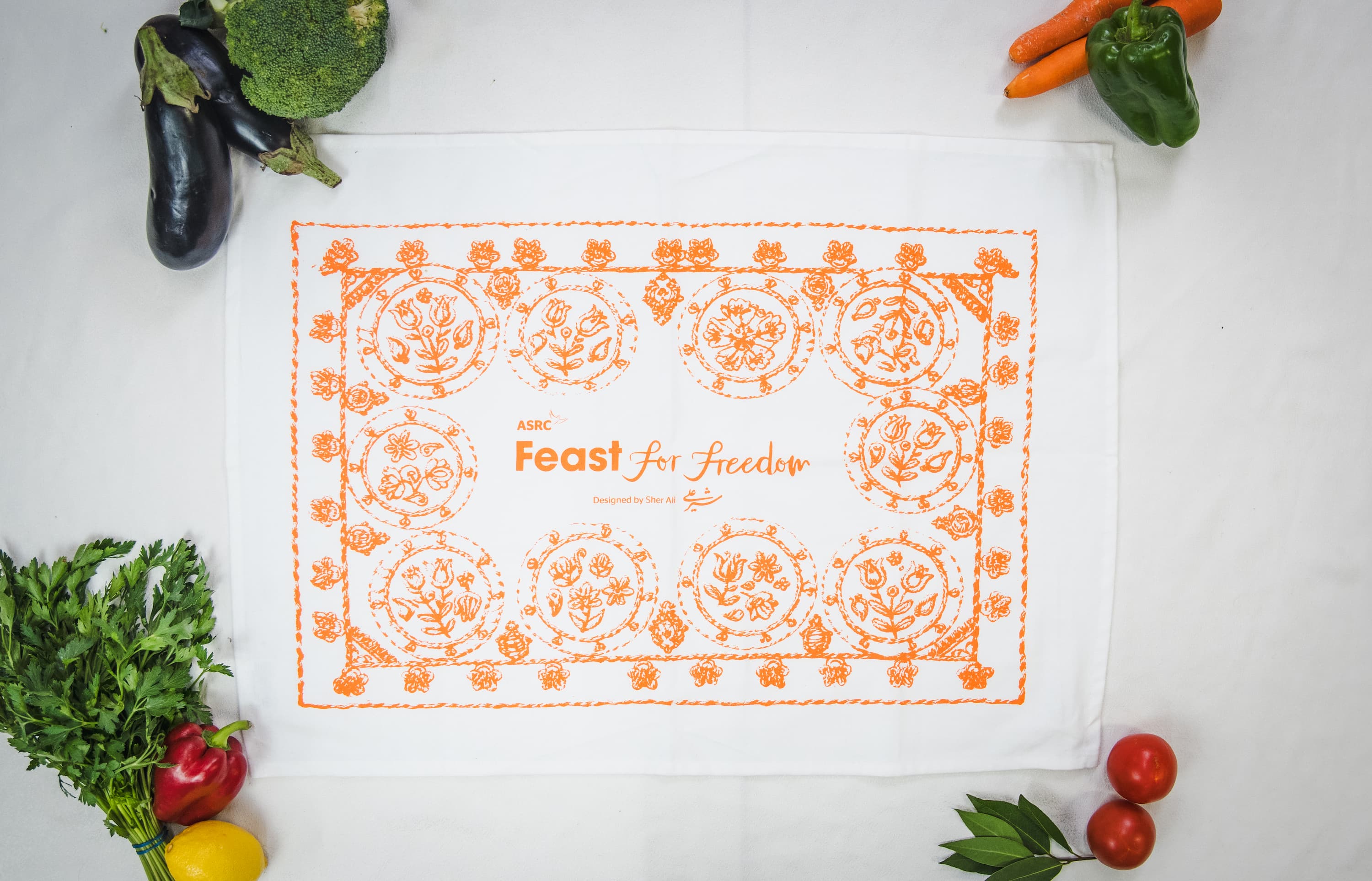 And if you make a personal donation of $30 or more at registration, you'll receive the 2026 limited edition Feast for Freedom tea towel designed by refugee artist Sher Ali.